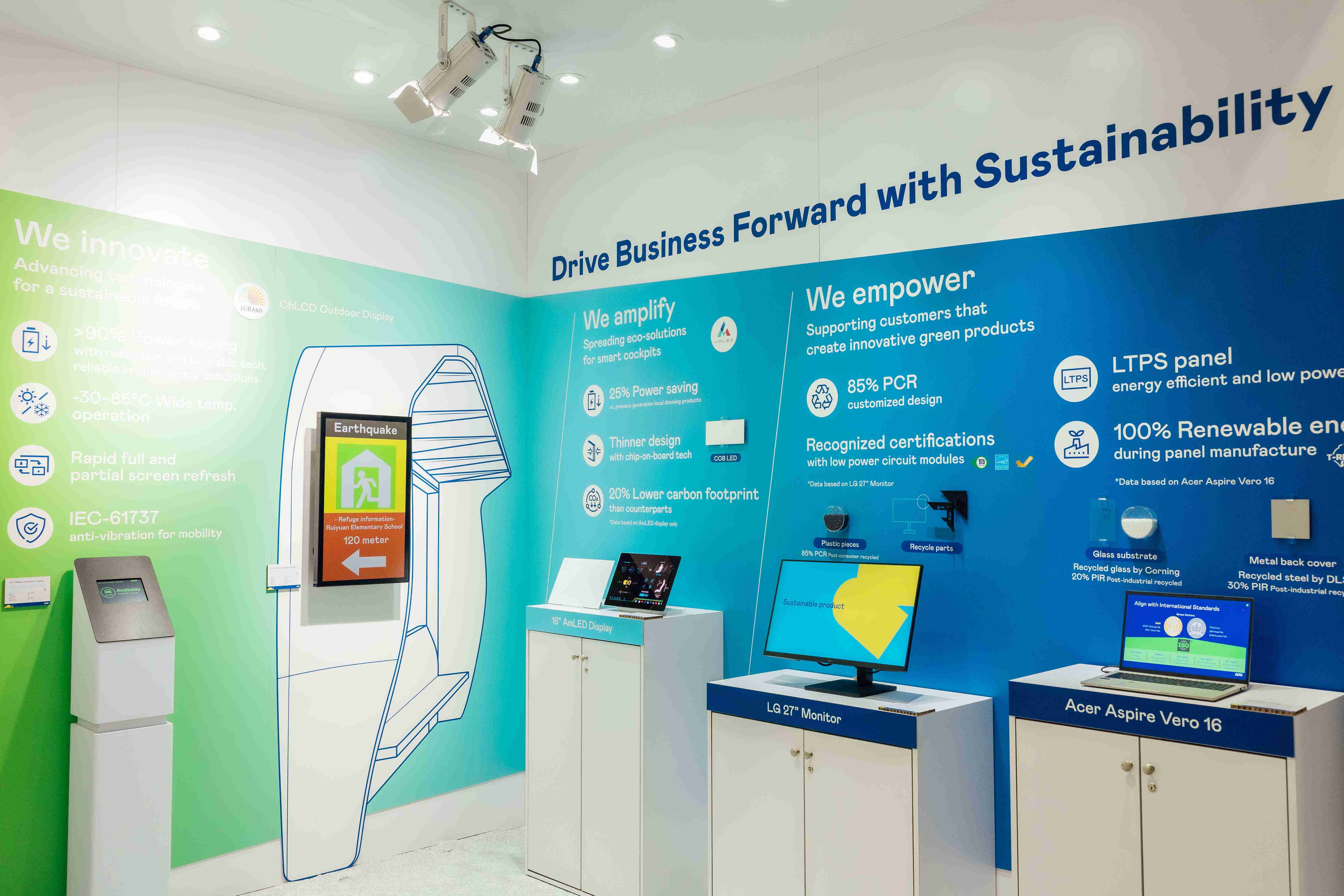 2121非凡运用创新显示技术HiRaso胆固醇液晶双稳态技术达到显示零耗能、、、扩大节能省电的AmLED显示技术应用于车用产品、、以再生的消费后回收(PCR)塑料及全绿电生产之面板,,应用于笔电及萤幕,,,增加绿色价值。。。。