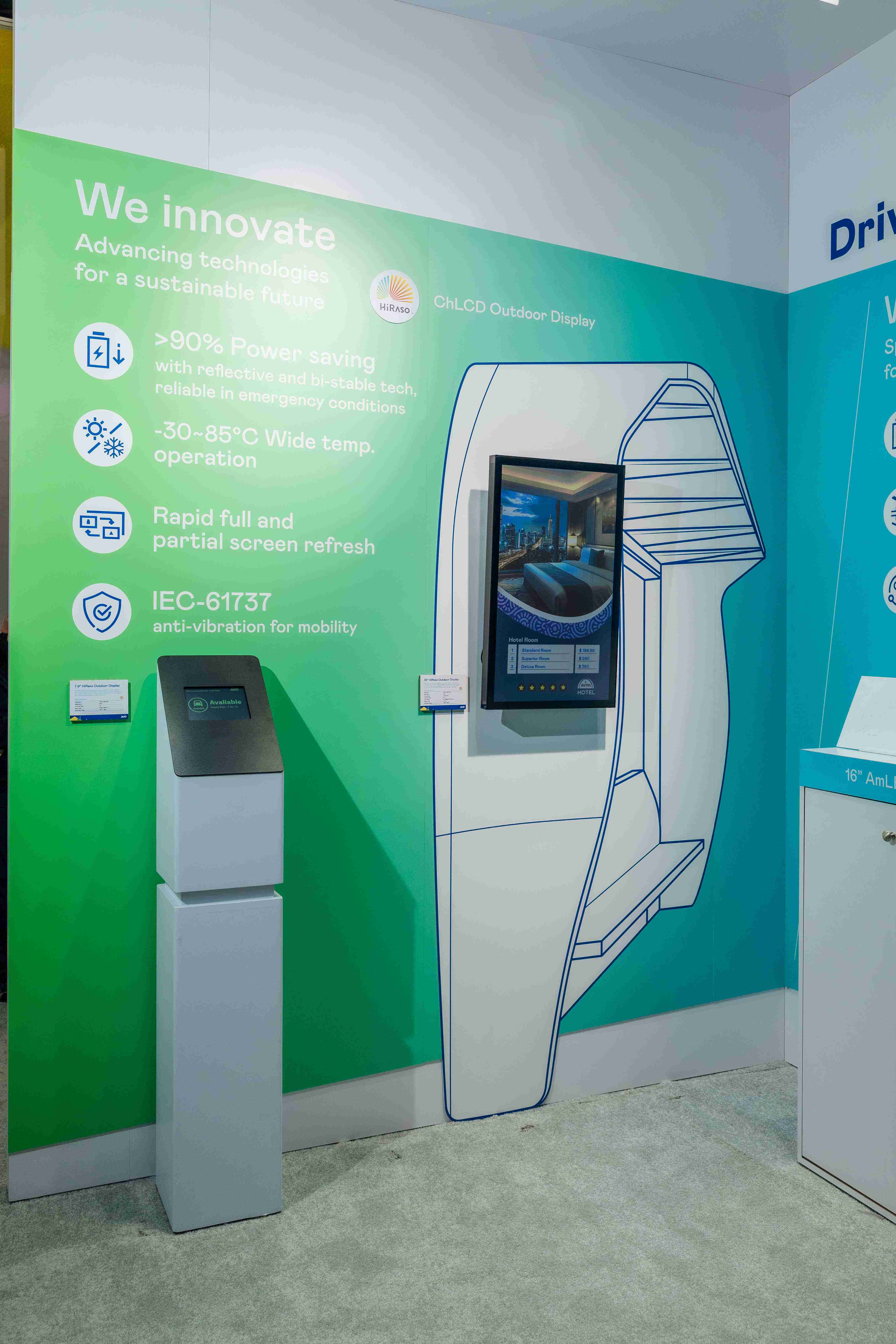 HiRaso胆固醇液晶显示器运用反射环境光线的方式,,,,呈现影像显示时零耗能的环保省电诉求,,,光线愈强愈能呈现绝佳的色彩饱和度及显示效果,,,,同时在摄氏-30度至85度间宽温的使用优势,,,为户外电子看板的新首选。。。。