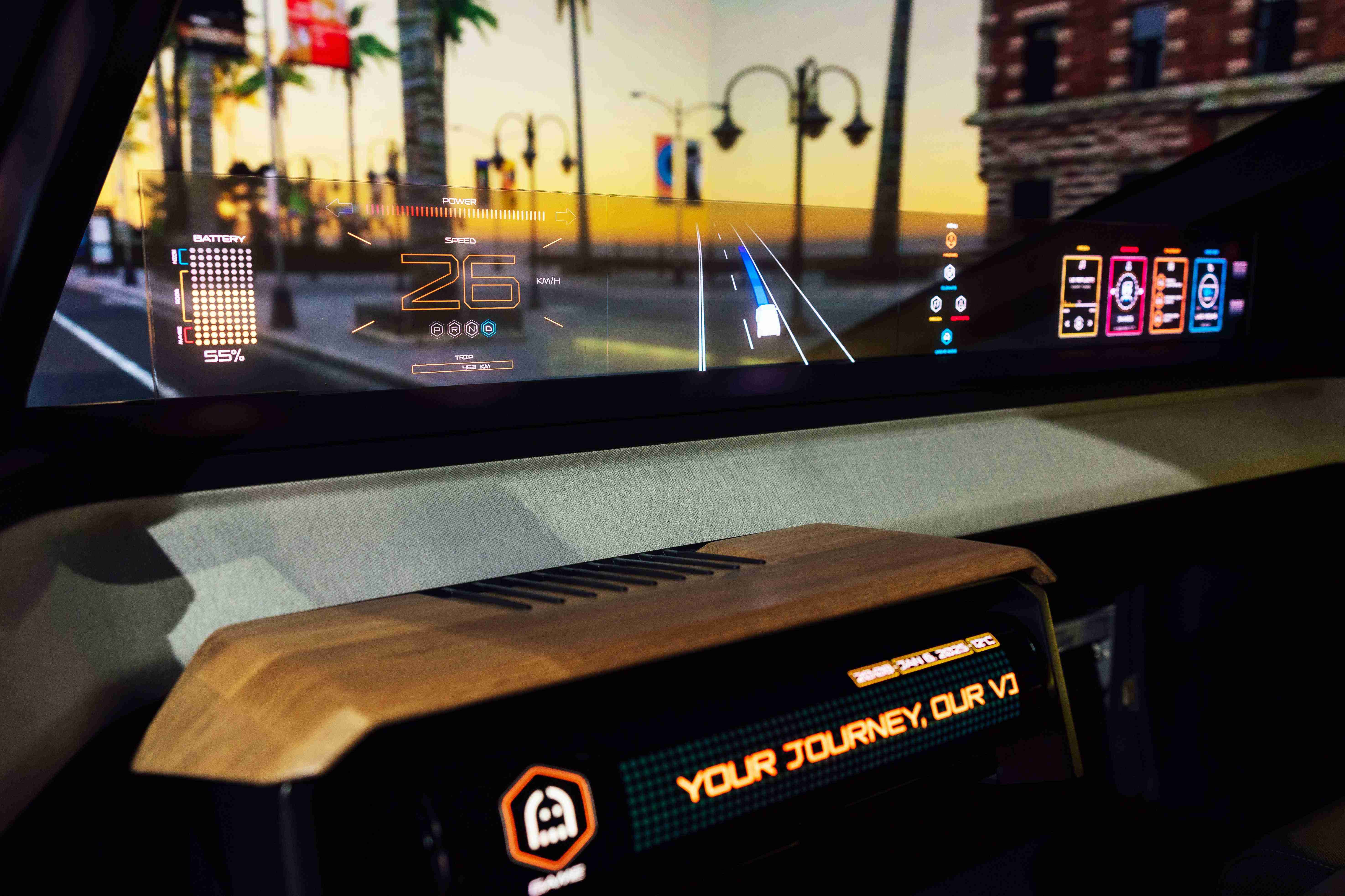 车用运算方案驱动无界透明显示介面(Horizon Image Glass),,整合仪表板、、中控及副驾显示功能为一体式全景呈现,,不仅提供清晰的外部视野,,,,亦能即时显示车辆状态、、、导航及路况资讯,,并赋予个性化设定与驾驶安全警示等加值化服务。。